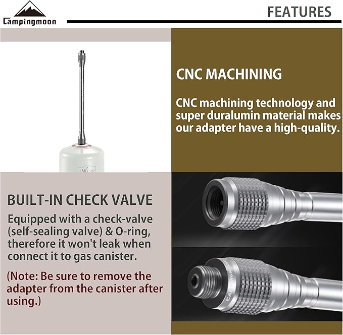 - BUILT-IN CHECK VALVE:Equipped with check-valve (self-sealing valve), therefore it won't leak when connect it to gas canister.(Note: Please remove the adapter from the canister after using.)