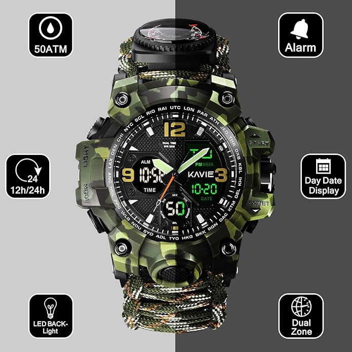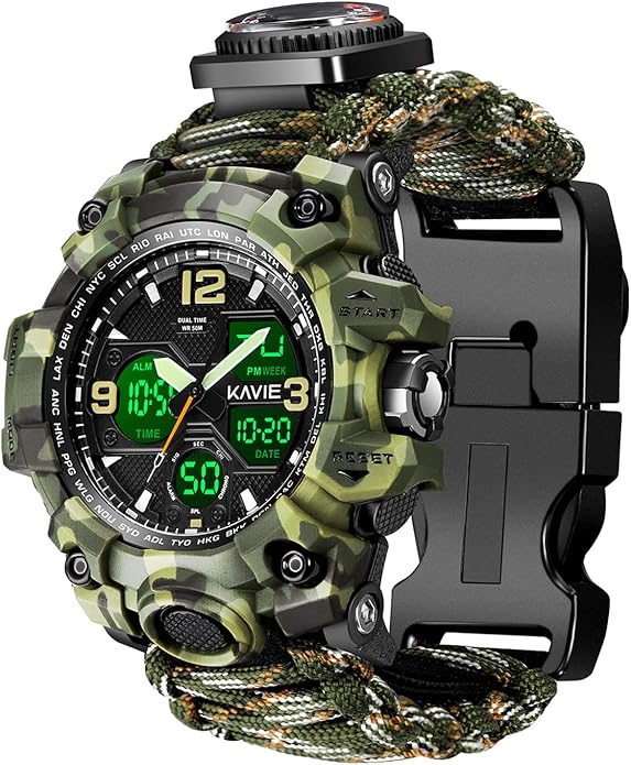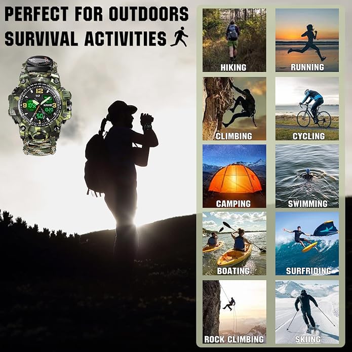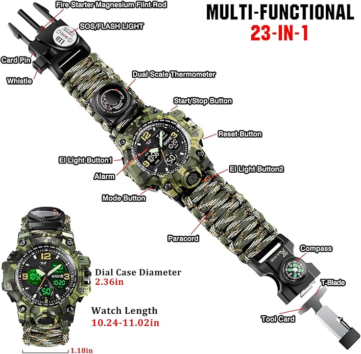 - 【23-IN-1 Military Survival Watch】:When you are exploring in the wild, you may face the danger of life and death. An emergency outdoor survival equipment artifact is born. It contains time dual display/Paracord/Fire Starter/survival whistle/SOS Led light/card pin/compass/thermometer/tool card/bottle opener/bicycle banner etc. 23kinds of powerful functions, high-quality, multi-functional, safe and practical survival watch.