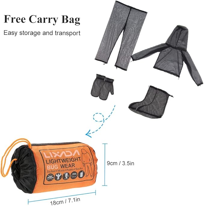 - 4 PIECE NET MESH SUITS: Lixada ultra-fine net mesh clothing equipped with jacket, mitts, pants, and socks, a perfect protection system for your outdoor activities. The translucent net yarn will not block your eyesight. Well packed in a solid and strong stuff sack, convenient to carry.