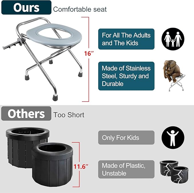 - DESIGNED FOR COMFORT: The comfortable seat and perfect chair height will provide you with the optimal relaxation and comfort. This camping portable toilet is suitable for long car trips, construction sites, fishing, winter fishing, hiking, outdoor living, parties, park festivals, camping. Patent No. US D971389 S.