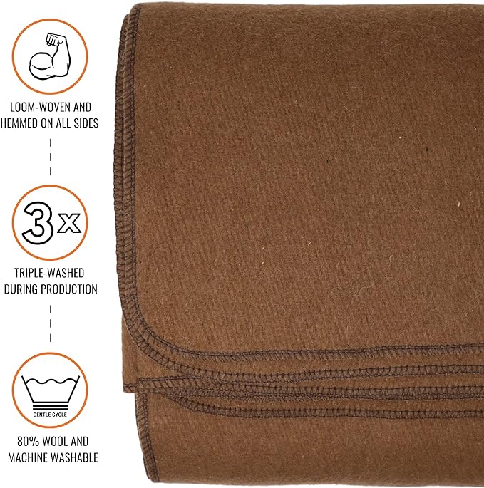 - WARM & DEPENDABLE - Wool is a time-tested natural fabric that will keep you warm, even when wet. The remainder of the blanket is composed of 20% hypoallergenic synthetic fibers for durability and washability. Because wool fibers are relatively short, longer synthetic fibers help secure the weave, minimizing shedding and adding years of life to your blanket.