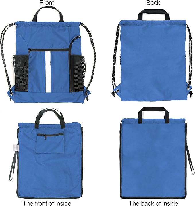 • Handle Design and Reflective Strip:Our draw string back pack bag has 2 handy carry handles allow for hand holding or hang it on the wall or door, very convenient for your use. Also the extra verticle reflective strips can enhance the high visibility to ensure your safe while in dark or dusk. Greatly reduce your chance of being hit at night.
