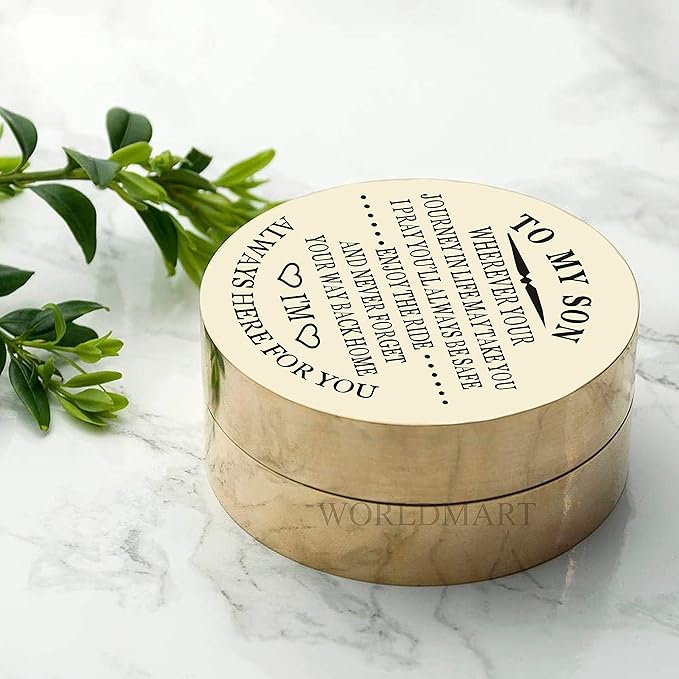 - Engraved Brass compass with leather case featuring the saying "To my son: wherever your journey in life may take you, I pray you’ll always be safe. Enjoy the ride and never forget your way back home. I’m always here for you.". What’s more unique than a personalized gift? Saying never comes off so the personalized gift will be appreciated by your son for many years to come.