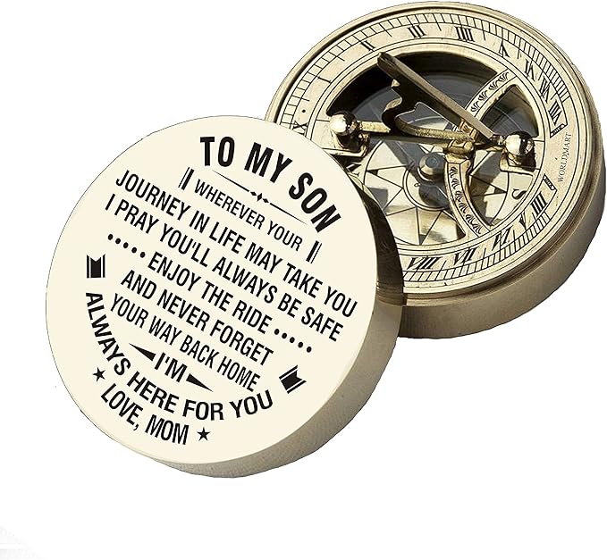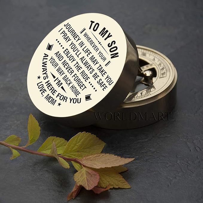 - Engraved Brass compass with leather case featuring the saying "To my son: wherever your journey in life may take you, I pray you’ll always be safe. Enjoy the ride and never forget your way back home. I’m always here for you. LOVE MOM ". What’s more unique than a personalized gift? Saying never comes off so the personalized gift will be appreciated by your son for many years to come.