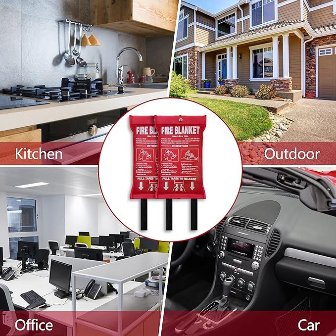 - [Multi-Purpose]: Afraid of fires? Don't worry, no matter what you're doing, our fire blankets are a great tool to carry around when it comes to fire. Emergency Survival fire blankets, which extinguish all types of fires by suffocation, including liquid and grease fires, are ideal for kitchens, fireplaces, grills, cars, camping, etc.