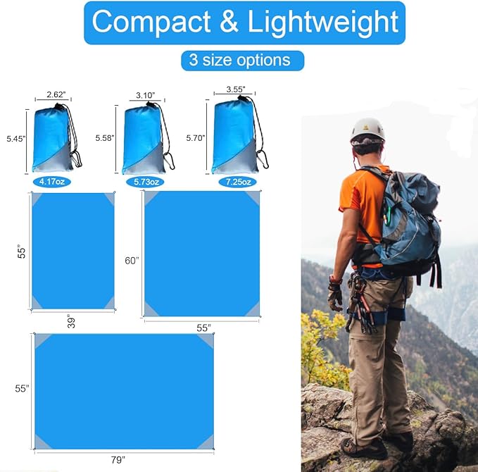 - Compact & Lightweight – This compact blanket can be folded to fit a small bag, it’s so handy even can be put in your pocket, it's also a ultralight tarp. Hook it onto your backpack, throw it in your bag or keep it in your car. It’s 7oz but a larger size. Carry it when you’re outdoors, it can be your small travel picnic blanket for festival, concert or backpacking etc, It’ll never be a burden.