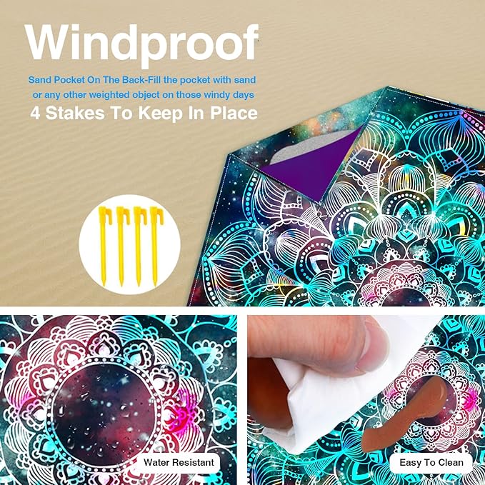 - 🌊4 × Sand Pockets & 4 × Anchor Stakes: The beach mat is equipped with 4 fixed anchors stakes and 4 triangle sand pockets at the corners of the beach mat which you can put some stones or sand into, so you don't have to worry about the beach mat being disturbed by wind and sand, and can enjoy your day at the beach.