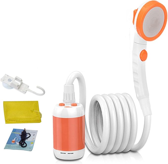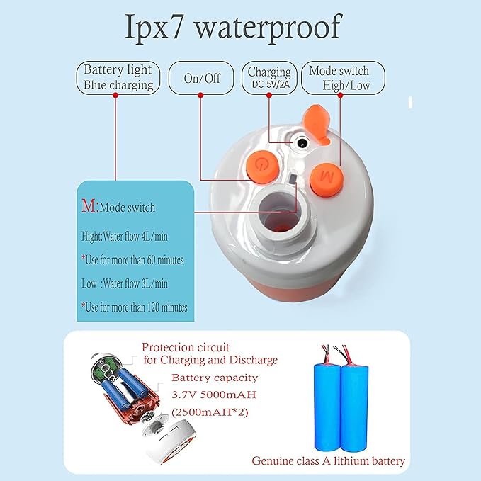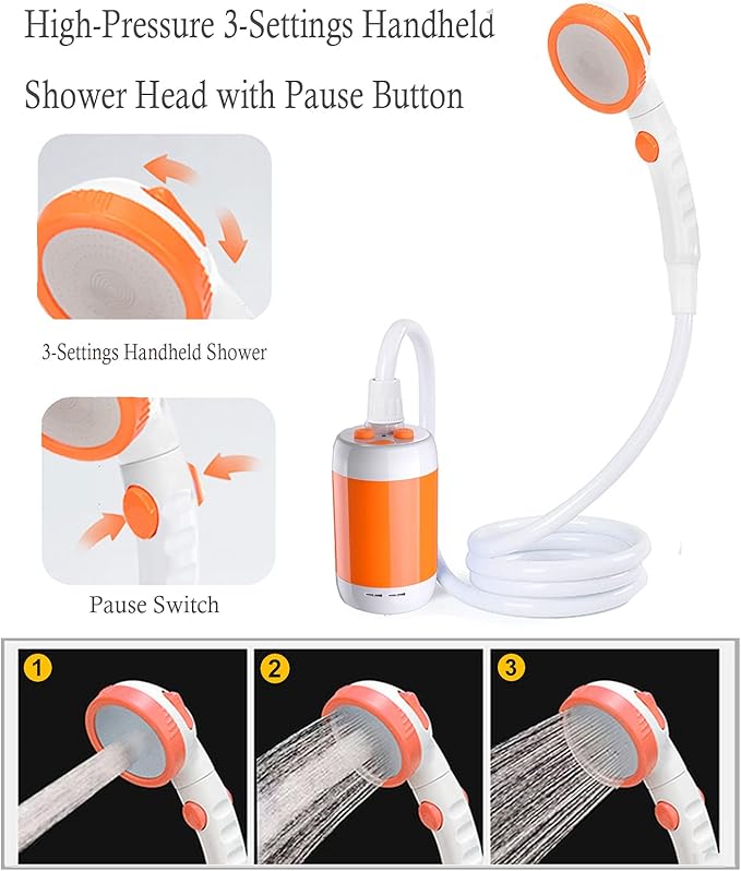 - Durable and Powerful: The portable electric shower is built-in with 5000mAh rechargeable battery, and it is equipped with low battery indicator light. Just fully submerse the pump in your bucket/tub of water and turn the motor on, you get a nice flowing shower.