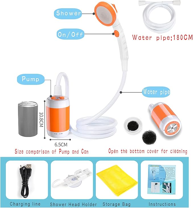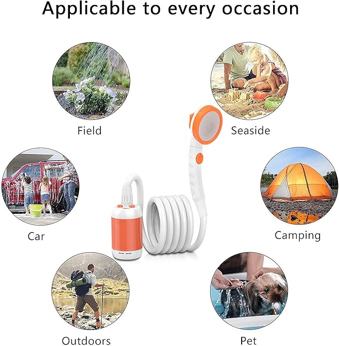 - Multi-use portable shower: Very suitable for outdoor, camping,hiking,kid bathing,pet cleaning,car washing, plants watering, window and backyard cleaning or washing sand on the beach,Scientific design, easy to carry: Scientific and beautiful design, easy disassembly, loading and cleaning.