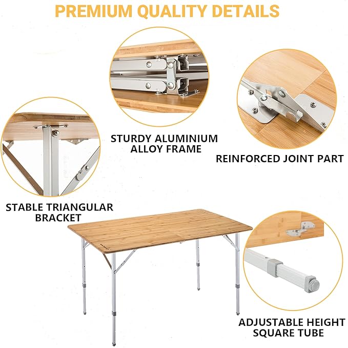 - 【2-FOLD STRUCTURE&NO TOOLS NEEDED INSTALLATION】 This camping table is super easy to install in seconds without any tools and the camp table adopts a collapsible design, the bamboo tabletop and aluminum bracket can be folded in seconds to save space and be carried like a suitcase on your trip, and it also fits most car trunks to meet your camping needs.