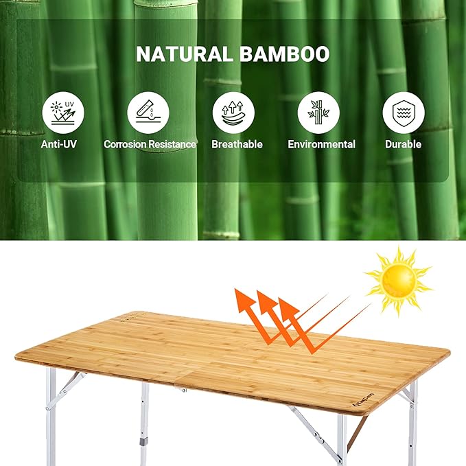 - 【LARGE PURE NATURE BAMBOO BOARD】Bamboo desktop area 47.2*27.6in. This bamboo folding table uses natural bamboo wood with bamboo texture and touched smoothly. The bamboo board is environmental and pretty durable, with waterproof coating and scratch resistance, anti-aging uv treatment and assure it a longer service life.