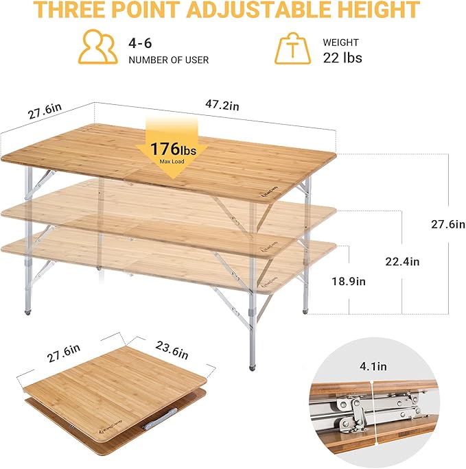 - 【176lbs LARGE LOAD-BEARING】This folding camping table is suitable for 4-6 person use. The thickness of the bamboo board is 0.5". This camping table with a square aluminum tube design increasing the weight capacity than the round one. And the triangular structure of the legs strengths the stability of the table.