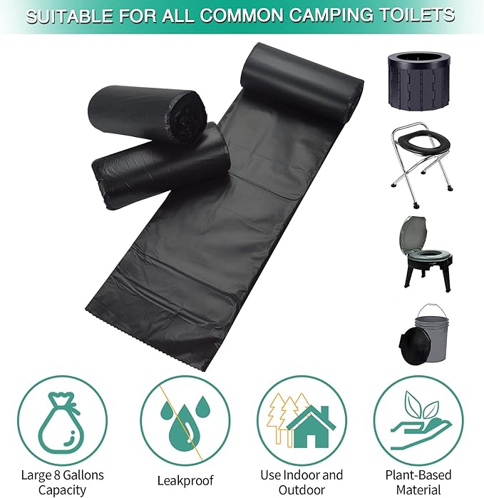 - 🌱[MATERIAL] - Our compostable portable toilet bags are made from plant-based materials that break down and easily decompose in 180 days when placed toilet waste bags in a compost environment. Leaving H2O,CO2 and humus which are Long-lasting and nontoxic.