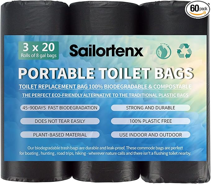 - NOTICE 🌱🌱🌱🌱🌱 Sailortenx toilet Bags are designed to fit all kinds of portable toilet seats. The disposable biodegradable portable toilet bags that are 8 Gallon sized work without leaks and you change it out within 24 hours of use!!!