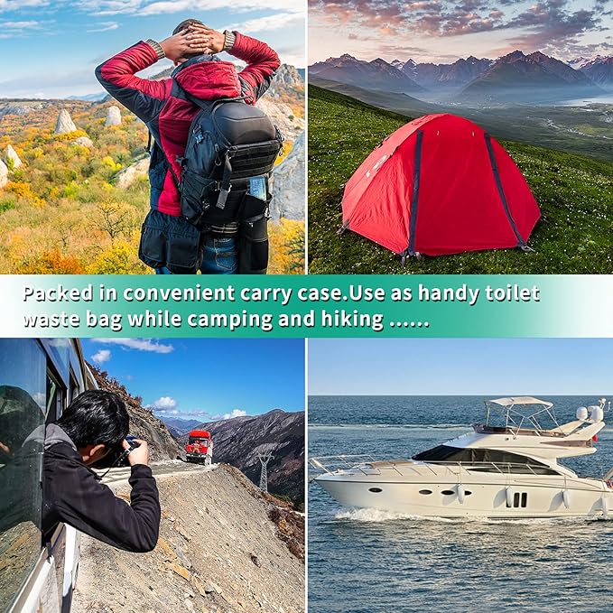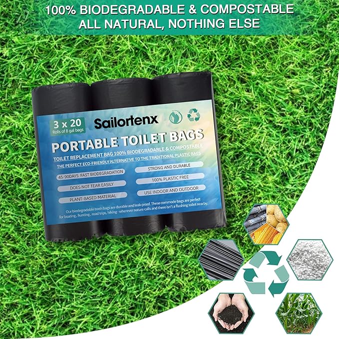 - 🌱[WHAT YOU GET] - 60 count portable toilet bags is 100% compostable biodegradable leak proof toilet waste bags.The disposable camping toilet bags perfect for boating, hunting, hiking - wherever nature calls and there isn't a flushing toilet nearby.