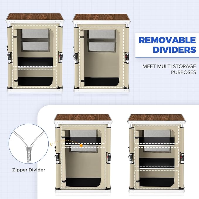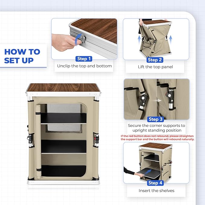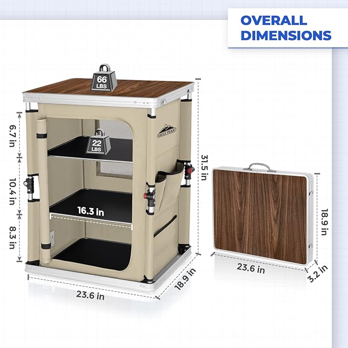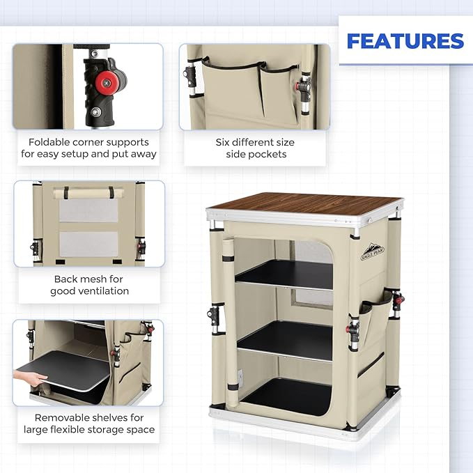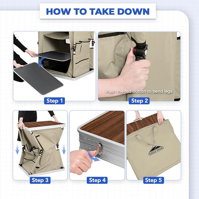 - BREATHABLE & EASY TO CLEAN: EAGLE PEAK portable camping table’s waterproof desktop and the 3 level shelves can be conveniently removed to clean when dirty. 2 mesh backside windows provide breathable airflow. NOTE:the table should not be used in the rain.