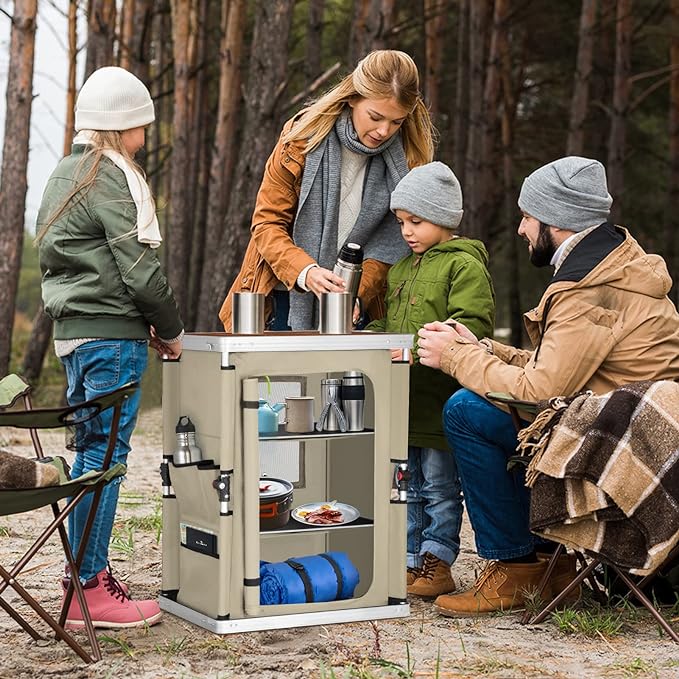 EAGLE PEAK Outdoor Folding Camping Table with Large 3-Tier Storage Organizer and Side Pockets, Easy Set Up Portable Aluminum Camping Kitchen, Beige