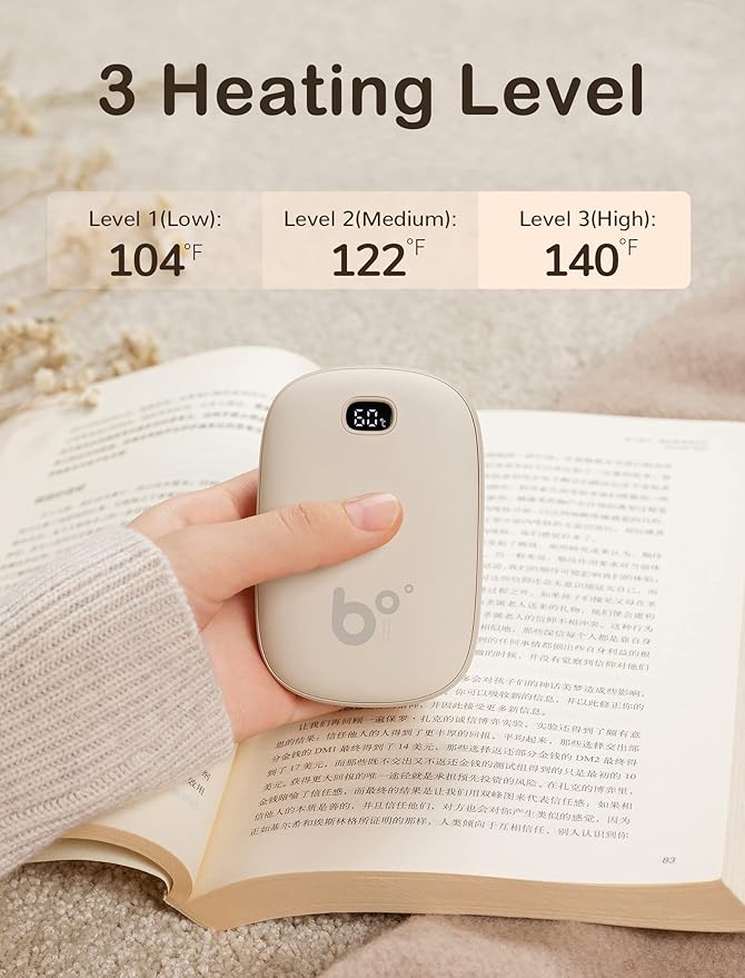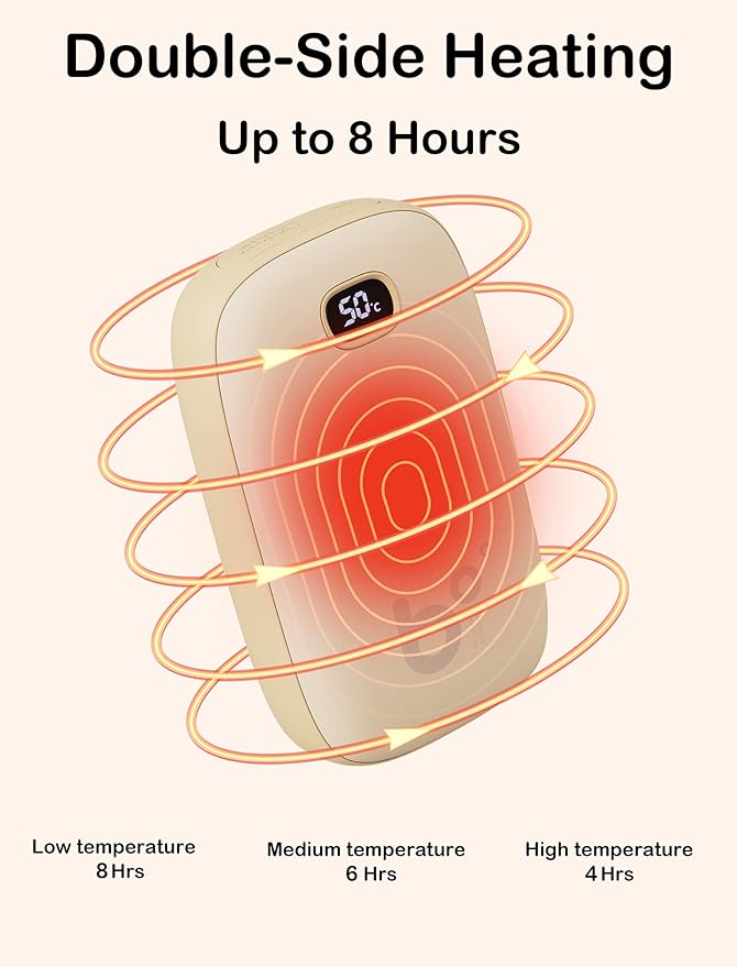 - 【3 Heat Levels & 8 Hrs Lasting Heating】JISULIFE hand warmer heats up in 3 seconds from double sides. Simply press the button to switch the temperature between 3 heating levels: 104℉ (40℃ ) /122℉ (50℃) /140℉ (60℃), Charging the hand warmer for 3-3.5 hours and warm your hands for 4-8 hours! Fitting for outdoor sporting, fishing, hiking, camping, skiing, travel, walking the dog in cold weather.