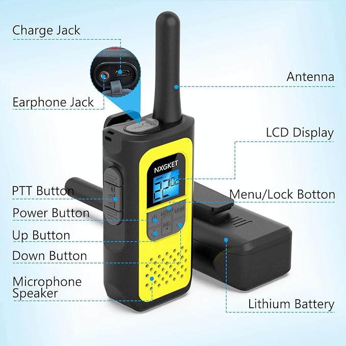 - Suitable for Anyone - Carry in backpack or on the belt, NXGKET walkie talkies rechargeable provides long-range communication and clear sound for hiking, biking, camping trip, road trip, scavenger hunts and so on. 4 piece set of radios walk-in talkies are also a great communication tool for men, women, kids, and elders to talk with others at home.