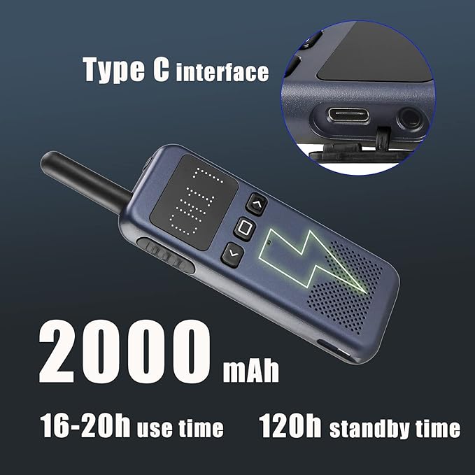 - Large capacity battery 2 way radio; 2000mAh lithium battery; up to 16-20 hours of continuous use; C-type interface supports charging on your computer; car; or mobile power; for your carry-on