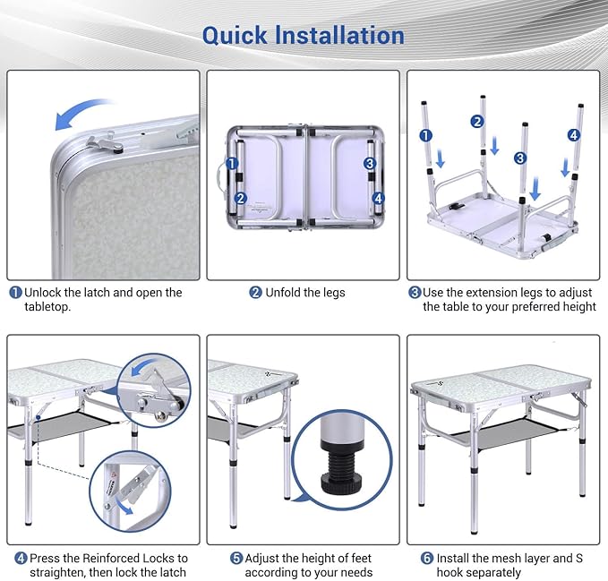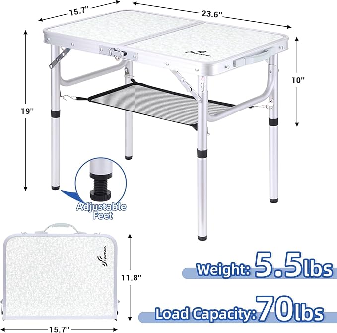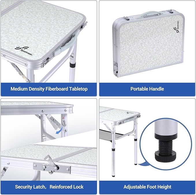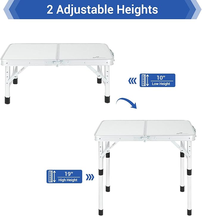 - Compact & Easy to Set Up: Say goodbye to the hassle of poles and complicated setups with the Sportneer adjustable height camping table! Simply open the table, insert the extended legs, secure the locks, and you’re ready to go. Folding down to just 16x12 inches and weighing only 5 lbs, but can support up to 70lbs, making it perfect for any outdoor adventure!
