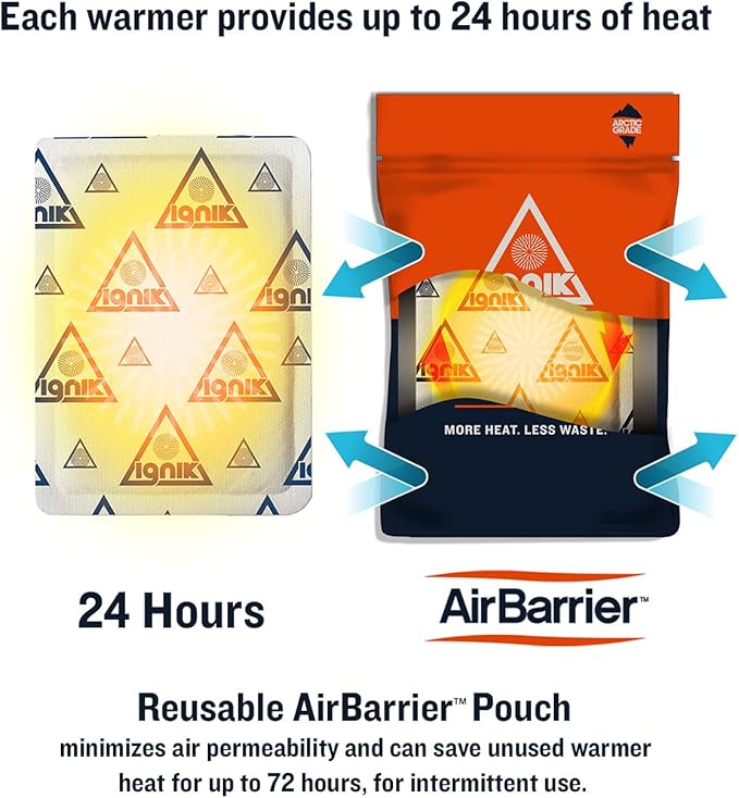 - Each oversize warmer provides up to 24 hours of heat; reusable AirBarrier Pouch minimizes air permeability and can save unused warmer heat for up to 72 hours, for intermittent use
