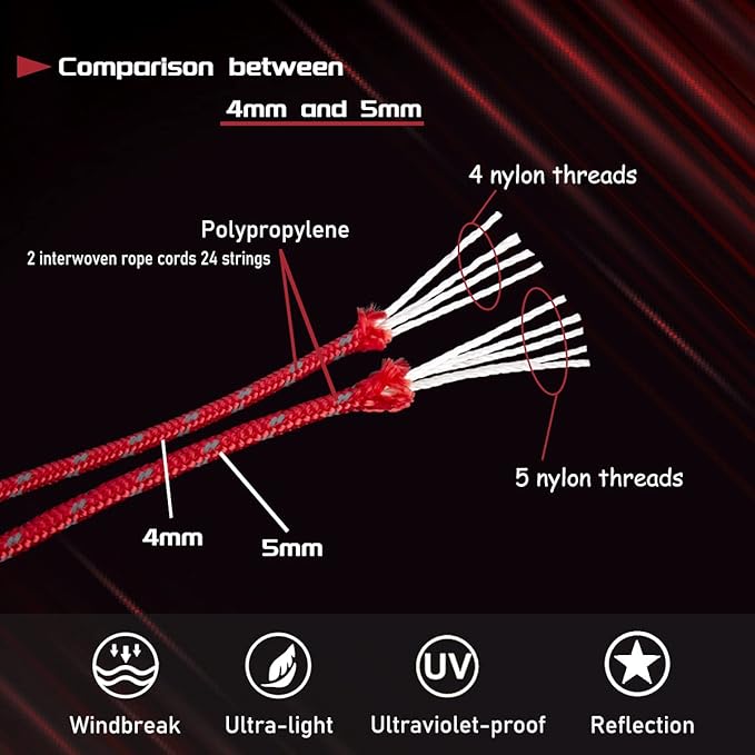 - 🌳Features: The guy lines with a diameter of 5mm is made of 5 nylon ropes, which can bear up to 910lb (413kg) load and can bear large impact force.