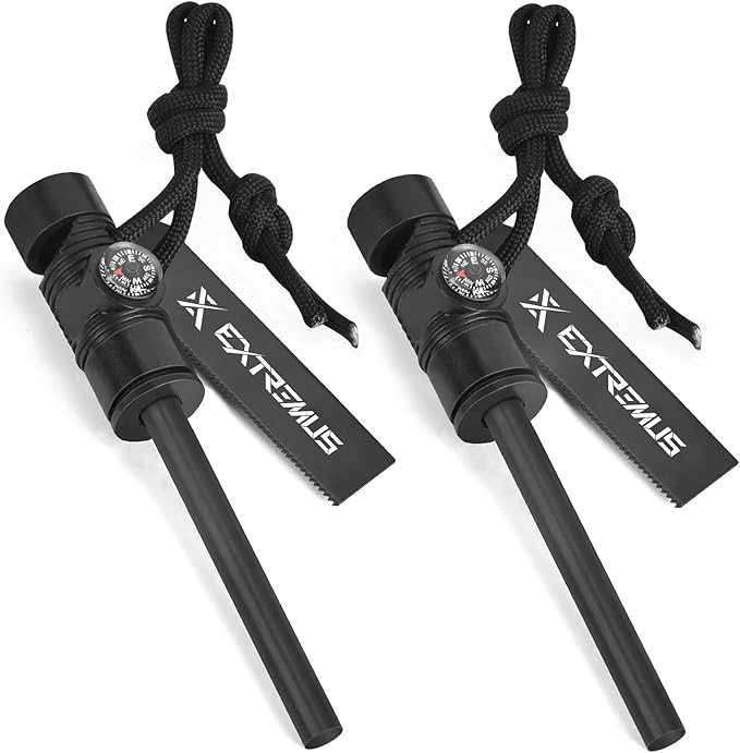 - 6-in-1 Emergency Multi-Tool – The new Extremus 6-in-1 Emergency Multi-Tool is a must have for every camper, hiker, hunter and anyone who spends time in the outdoors. This two pack set includes the high-temperature magnesium rod (2), Steel Striker (2), Built in Compass (2), Emergency Whistle (2) and two lengths of paracord. Fire Starter with Carabiner Survival Tool included one Fire Starter and our patent pending Paracord Carabiner tool.