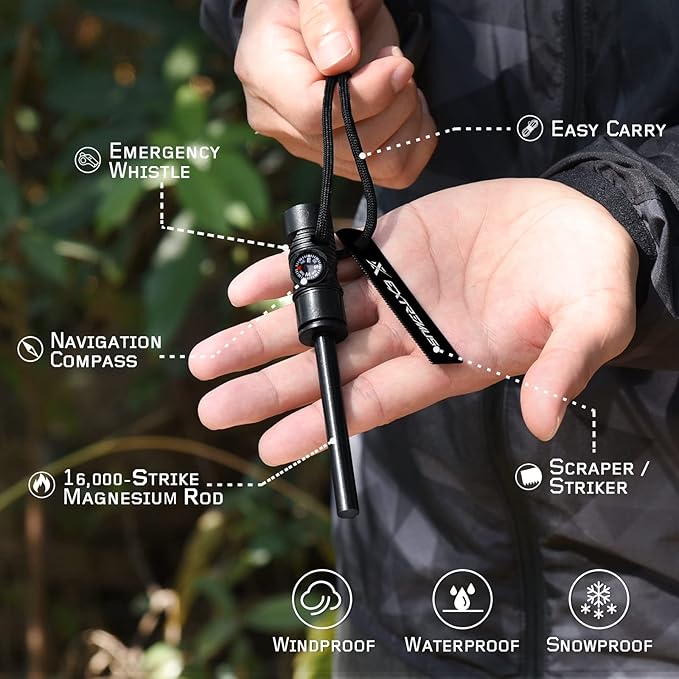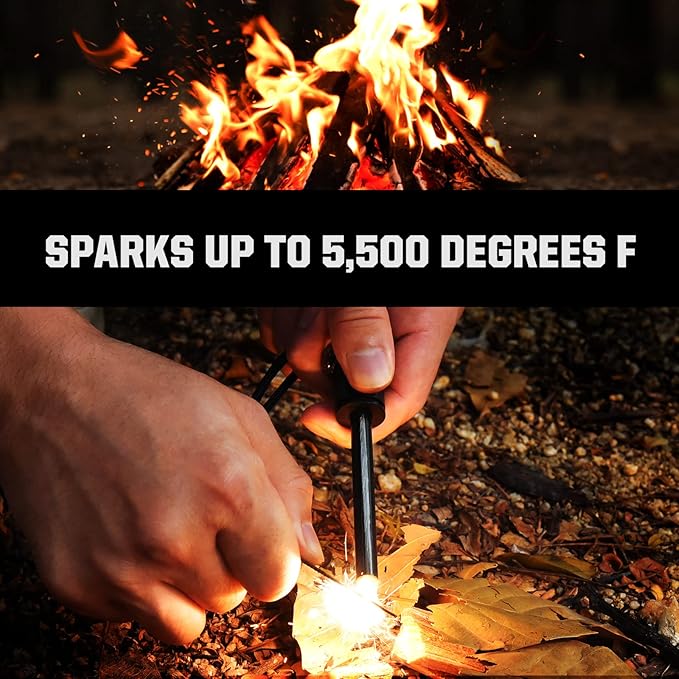 - High-Temp Magnesium Rods – The magnesium rods will provide thousands of strikes to start fires in almost any condition. They provide sparks as hot as 5,500 Degrees F to easily start fires in extreme conditions. Sharply strike the included steel strikers against the rod to generate sparks in the direction of kindling and fire-starting material. There are two magnesium rods included in this kit so you can always have one handy while in the outdoors.
