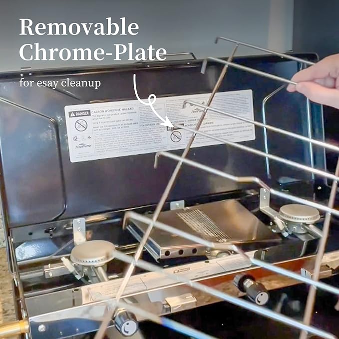 - ADJUSTABLE 3 BURNERS : This camping gas stove is equipped with 3 independently adjustable knobs, two of Piezo ignition burners with 6,600 BTU power. The middle downward burner is designed for toasting, 7200BTU power and requires manual ignition. We recommend that you use a piezo lighter. It relies on heat radiation to heat and won't burn the toast