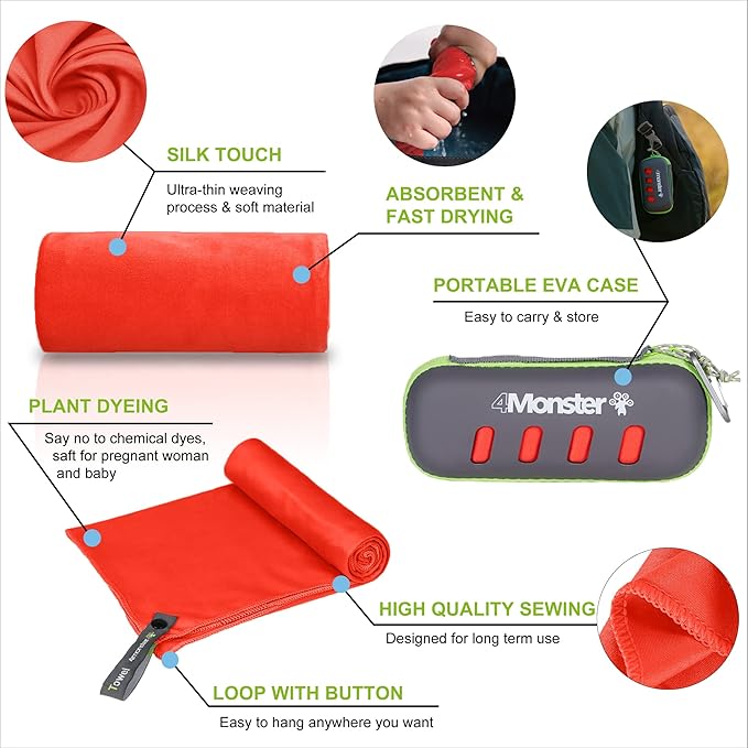 4Monster Camping Towel Super Absorbent-Quick Dry Microfiber Towel Ultra Compact & Soft-Travel Towel Lightweight for Backpacking,Hiking,Gym,Beach,Swimming,Yoga