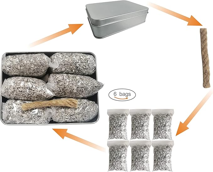 - 6 resealable zip closure bags in 1 of free tin container, each bag is packed full of shiny new shaved, shreds, chips, spiral magnesium without oxidation, the bag is 3 1/6 x 2 1/2 inch.
