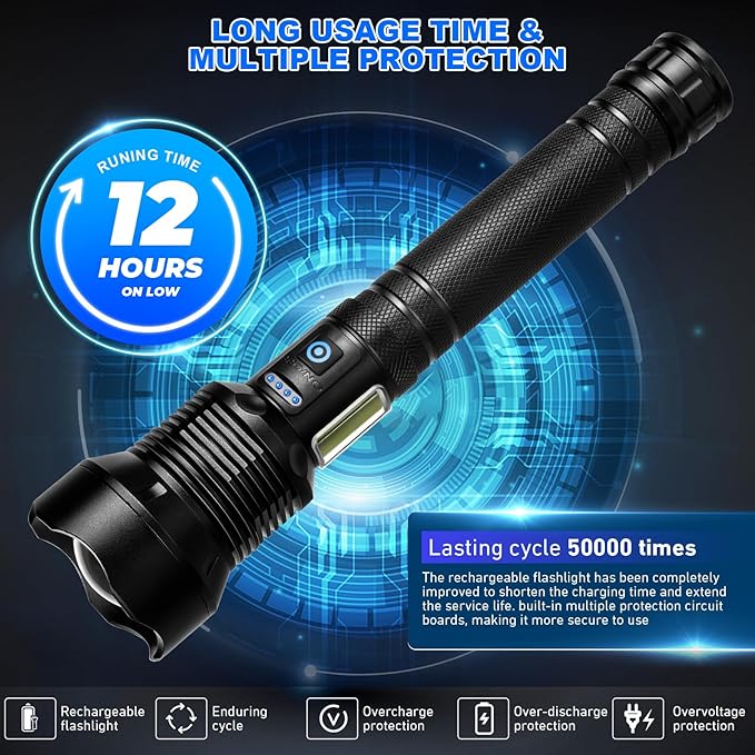 - 🔦【Rechargeable Flashlight & Power Indicator】Rechargeable flashlight uses a large capacity ΒATTERY of 10000 mAh. It can last 8-12 hours on a single charge. The upgraded ΒATTERY has a longer lifespan and can be charged over 50,000 times. while the USB output port allows the flashlights to be used as a backup mobile power source for your phone and other devices. Each blue indicator represents 25% of the energy, you can easy to know the status of the ΒATTERY.