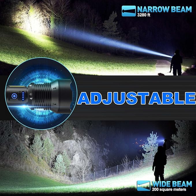 - 🔦【Adjustable Light Distance】This powerful flashlights can adjust light distance. The large-area Lighting, provide you with bright and wide vision when you walk at night. the long-range Lighting for long-range observation, max beam range to 3280ft, accurately help you detect the field of vision.