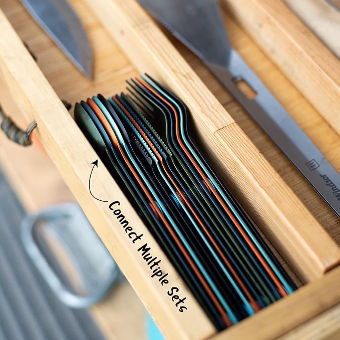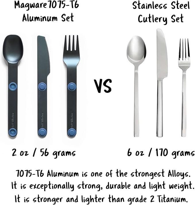 - DURABLE CUTLERY MATERIALS: Crafted from quality aluminum, these utensils are built to last. The magnetic design keeps them securely stacked, while the magnetic make them both functional and fun. Perfect for outdoor dining, camping, or family picnics.