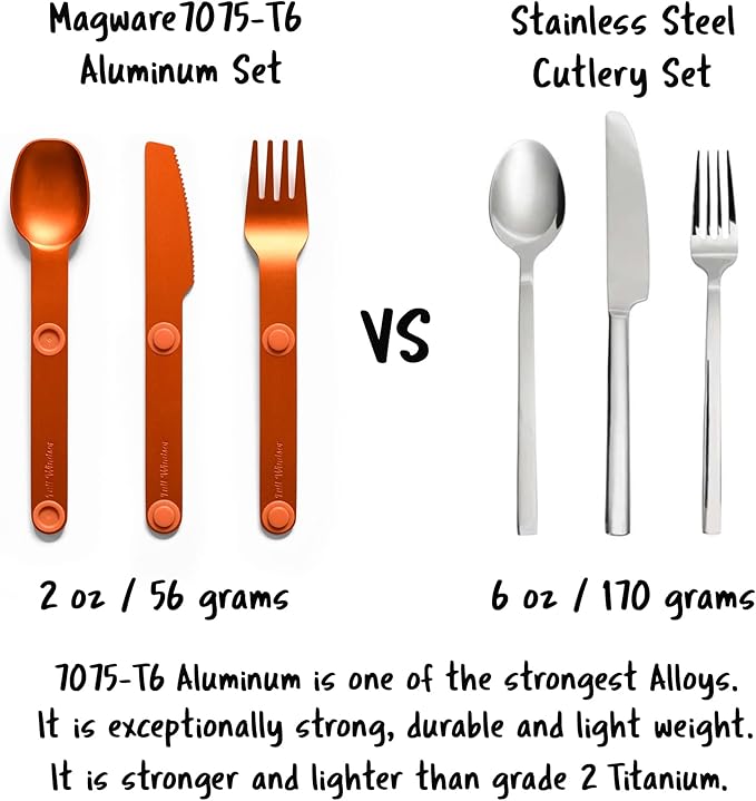 - DURABLE CUTLERY MATERIALS: Crafted from quality aluminum, these utensils are built to last. The magnetic design keeps them securely stacked, while the magnetic make them both functional and fun. Perfect for outdoor dining, camping, or family picnics.