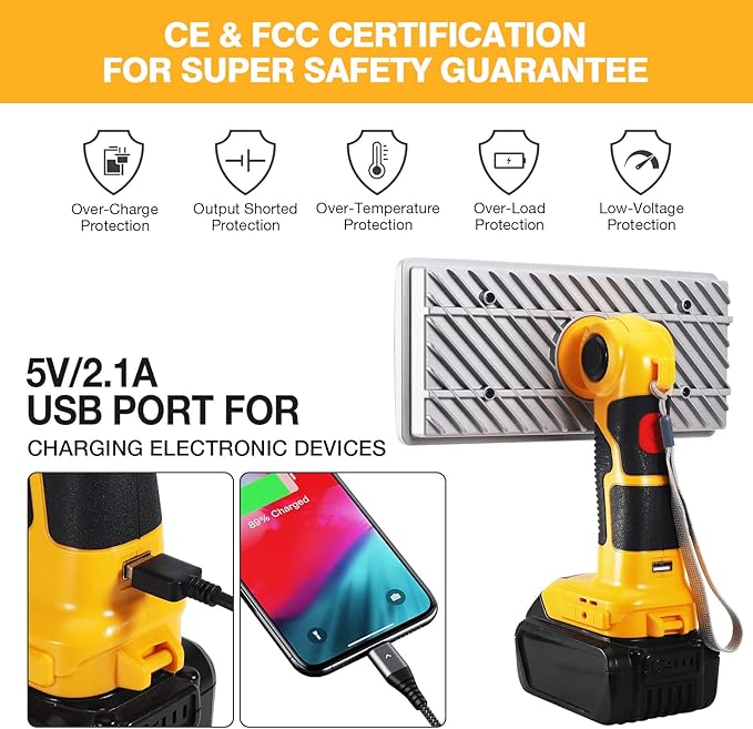 - 40W 4200LM SUPER BRIGHT SPOTLIGHT: The 5V/2.1A USB port on the handle can charge your mobile device for emergency use. Such as phones, pad, digital audio devices MP3 MP4 player, usb mini fan etc.