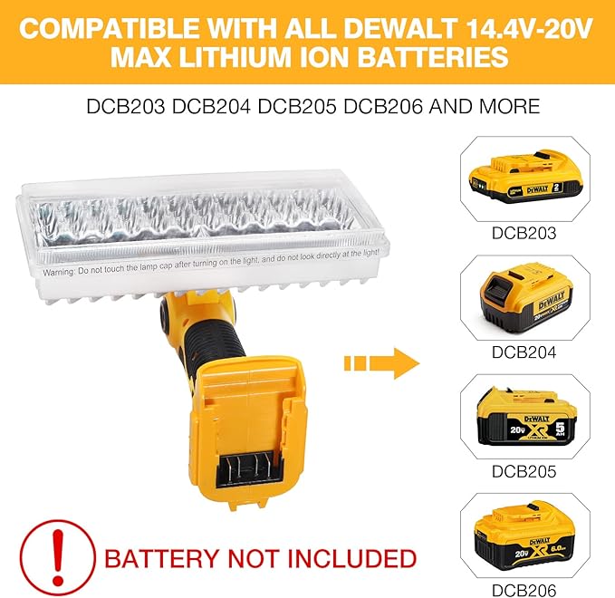 - For DEWALT 20v BATTERY: Cordless LED Work Light compatible with dewalt 14.4V-20V Max Lithium Ion Batteries DCB206 DCB205 DCB204 DCB181 DCB182 DCB200 DCB203 DCB205-2 DCB204-2 DCB206-2 and More. (Battery Not Included).