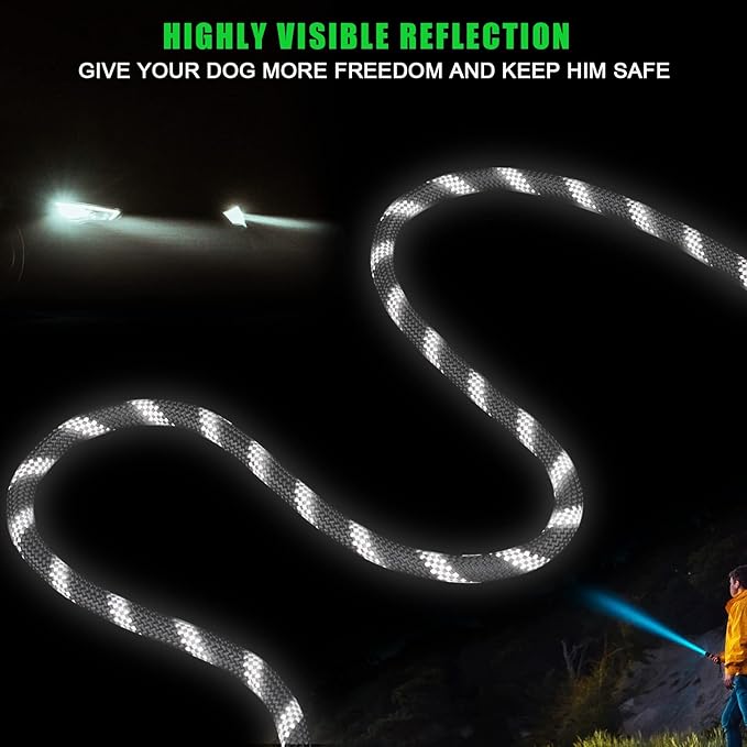 - 🐕 『High Quality & Tangle Free』: Dog runner leash for yard is made of reflective strengthened rescue rope material,Durable and wear-proof enough to withstand the most intense pulling. The screw gate locking design that heavy-duty buckle reduces the chance of opening the door. The stainless steel clip rotates 360°tangle-free swivel, which brings more comfort and safety to the dog,and play out in your open yard without getting all tangled up locked clasp.