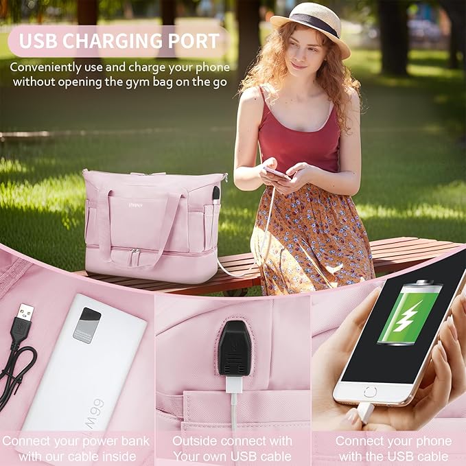 - Multi-function Gym Bag:With a USB port, this gym bag for women provides easy access to charge your phone on the go. Size: 18.5x14.2x8.7 inch. Large capacity and multiple pockets: 2 pockets and 1 large zippered wet bag inside. And this women's sports bag can store towels, cosmetics, iPad, clothes, food, drinks, etc. Two exterior side pockets to store a water bottle or umbrella. A large front pocket and a zippered back pocket for storing your keys