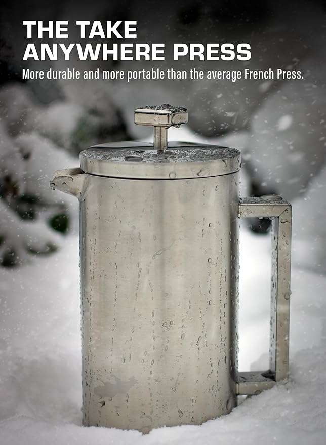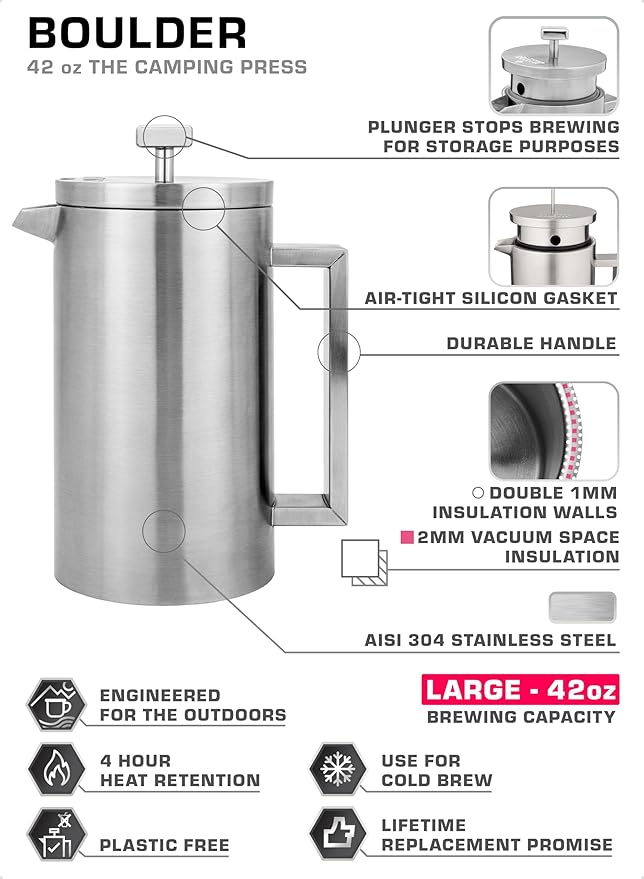 - KEEP YOUR COFFEE HOT: This insulated Camping French Press will keep your coffee hot. Don’t settle for cold coffee. Bring the Boulder.