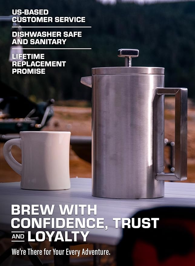 - LIFETIME REPLACEMENT GUARANTEE: This large camping coffee press is made of AISI 304 stainless-steel with the same 14-gauge industry standard material used for building construction – a metal French Press coffee maker built to last