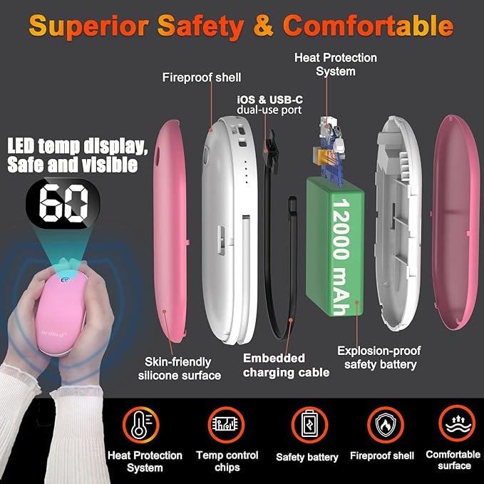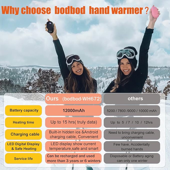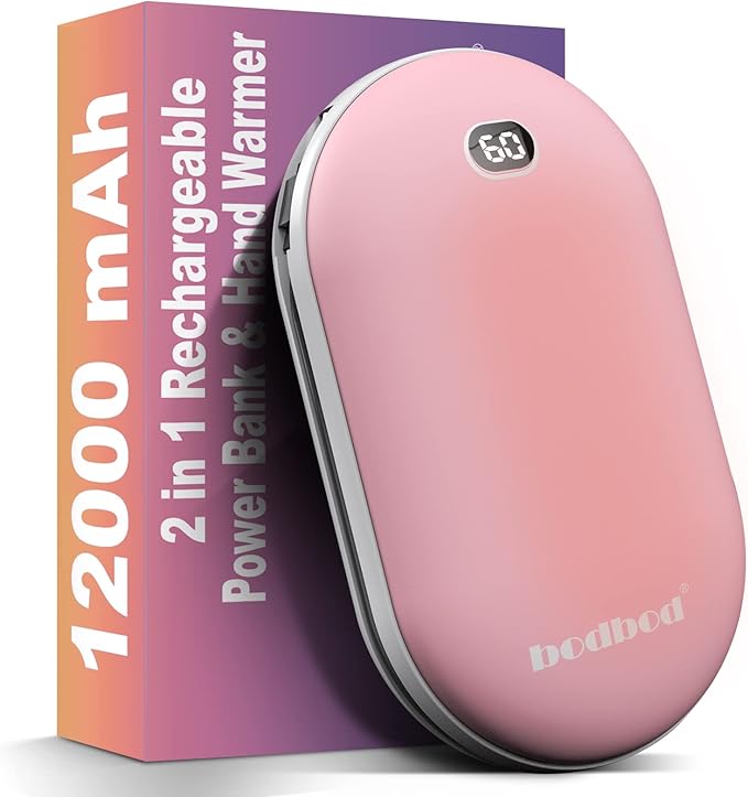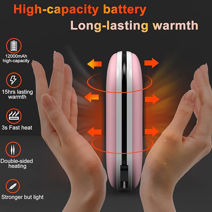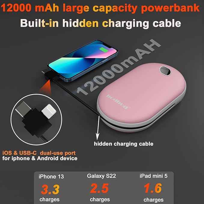 - 【12000mAh Ultra high capacity Battery】---It has the largest capacity among hand warmers, and the best grip and portability in the power bank,the use time is more than twice that of 5200mAh and 20% longer than that of 10000mAh,long lasting warmth 8-15 hrs, it can be heated for almost a whole day.Meawhile,provides 3.3 charges for iPhone 13, 2.5 charges for Galaxy S22 and 1.6 charges for iPad mini 5.