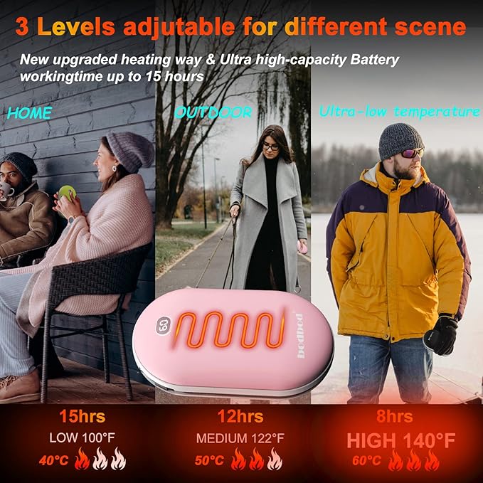 - 【LED Digital Display & Safe Heating】--- Smart LED display can show 3 levels of temperatures(40/50/60) ,3 levels of temperatures 100°F/122°F/140°F, easy to having a comfortable and DOUBLE SIDES heating.Our electric hand warmer certificated with UL,CE, FCC, ROHS, PSE,built-in overheating and over-charging protection sensors