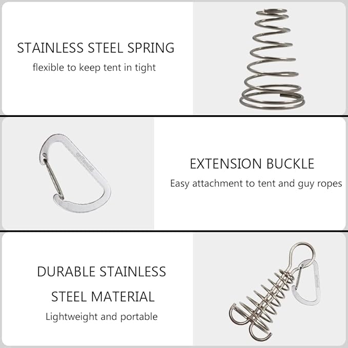 - 【Premium Quality】 Durable stainless steel material and flexible springs keep anchor pegs from sliding and tent stay taut during high winds. Suitable for boards of different thickness.