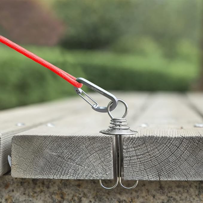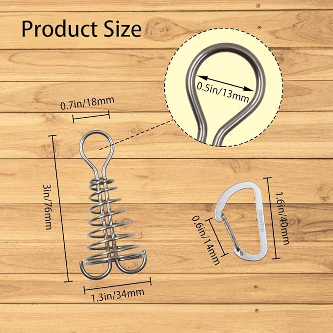 - 【Package Included】10Pcs silver tent stakes with carabiner clips and spring buckle, enough for outdoor activities to set tents on decks. Fit for the max depth of wood 1.57"/4cm.