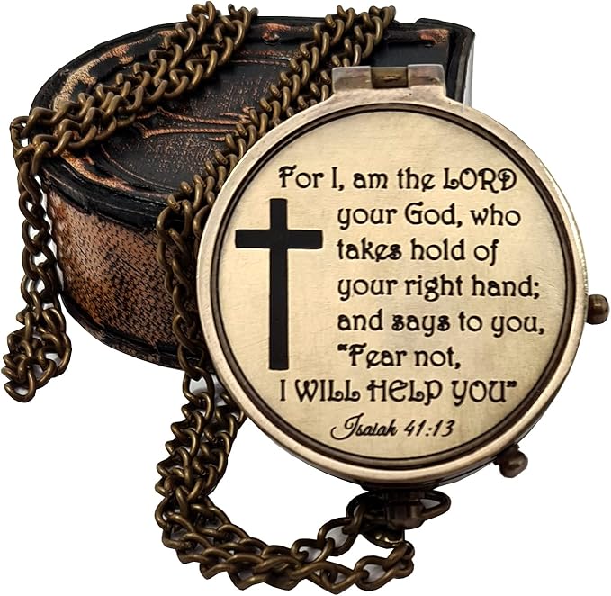 - Product Specifications: The compass with the leather case has a message from the Bible engraved on its outside. It says “For I am the LORD your God, who takes hold of your right hand; and says to you, “Fear not, I WILL HELP YOU” - Isaiah 41:13”. The compass measures 2.36 x 1.97 x 0.71 inches and weighs120 gms.