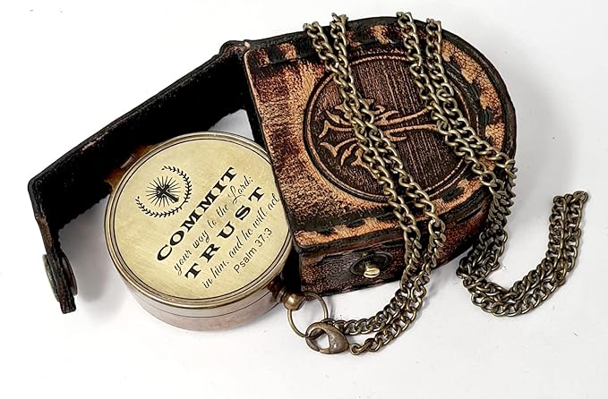 - Product Specifications: The Vintage Compass and Case Set has a removable chain that can be attached to a ring at the head of the antique decor compass gift. It is engraved with the psalm “COMMIT your way to the Lord: Trust in him. And he will act – Psalm 37:3” and has wings on either side.