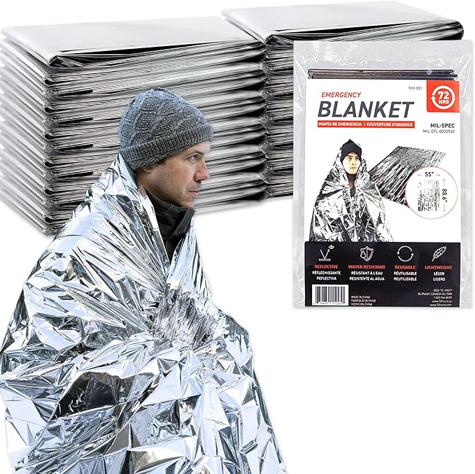 72 HRS MIL-SPEC Emergency Space Blankets – Mylar Survival or Emergency Thermal Blankets for Camping, Hiking, Marathon, First Aid, Emergency Preparedness, Extreme Weather, Shelter (12-Pack)