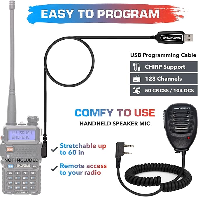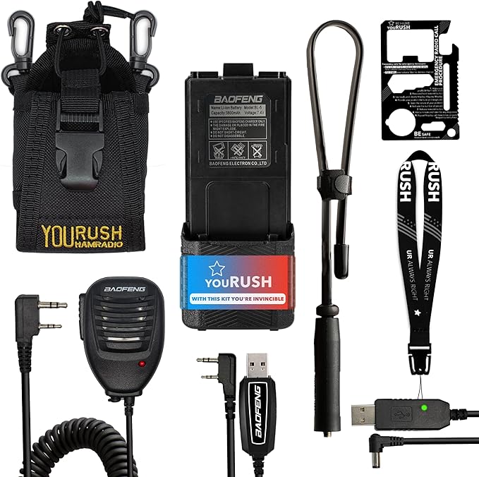 - Special Feature : Baofeng battery BL-5 3800 mAh 1x USB Charging cable 1x Baofeng programming cable PL2303 1x Tactical antenna 18,7`` 1x Baofeng speaker mic 1x youRUSH Lanyard 1 x Multitool 1 x Radio Holder Baofeng battery BL-5 3800 mAh 1x USB Charging cable 1x Baofeng programming cable PL2303 1x Tactical antenna 18,7`` 1x Baofeng speaker mic 1x youRUSH Lanyard 1 x M… See more